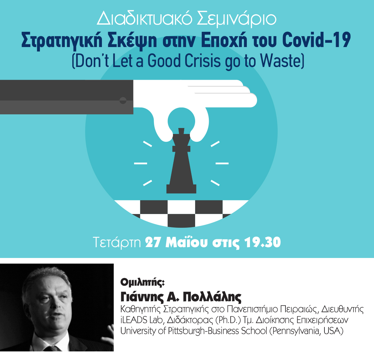 Μια ρεαλιστική προσέγγιση του θέματος “Στρατηγική σκέψη στην Εποχή του Covid-19 – Don’t Let a Good Crisis go to Waste” είχαν την ευκαιρία να παρακολουθήσουν οι συμμετέχοντες στο διαδυκτιακό σεμινάριο την Τετάρτη 27 Μαΐου από τον Γιάννη Πολλάλη, Καθηγητή Στρατηγικής στο Πανεπιστήμιο Πειραιώς.